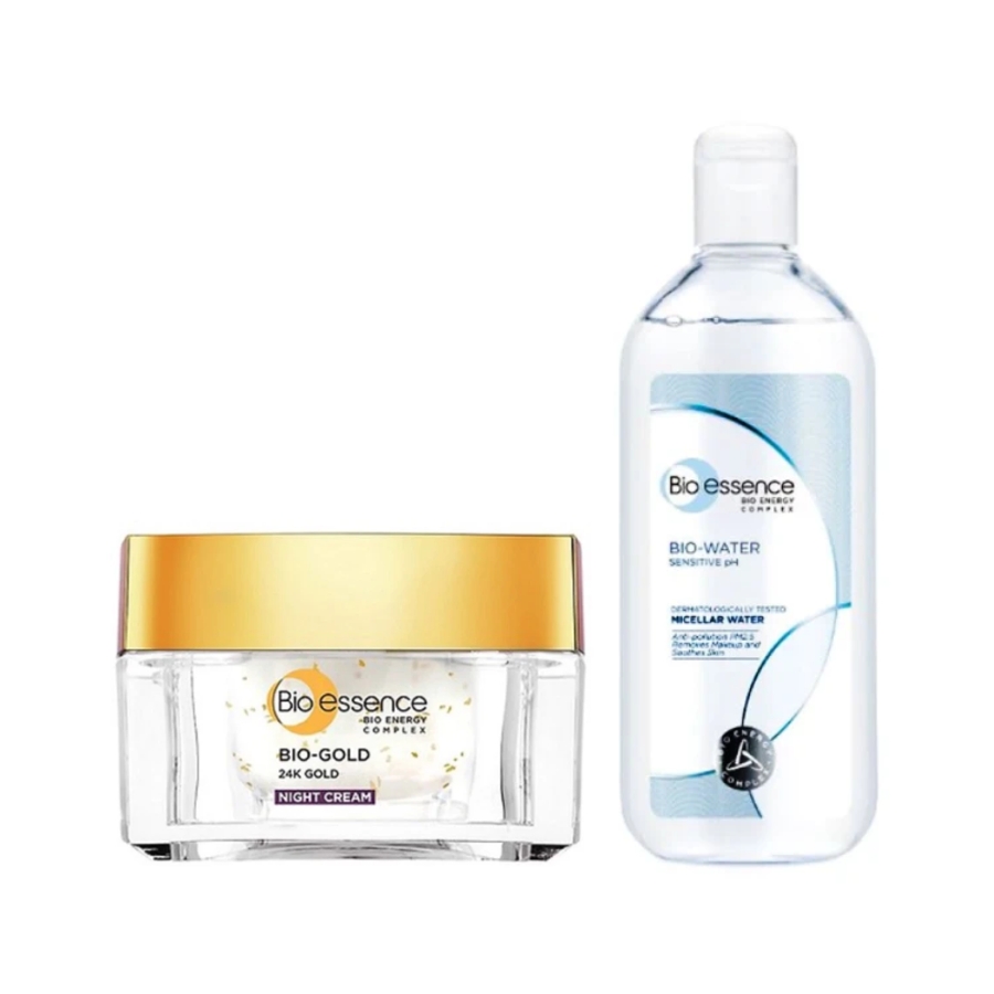 Bộ sản phẩm Bio-Essence bao gồm hai sản phẩm chính: Kem Dưỡng Bio-Gold Ban Đêm (40g) và Nước Tẩy Trang Bio Essence Water (400ml). Mỗi sản phẩm có những công dụng và đặc điểm riêng biệt, nhưng khi kết hợp lại, chúng tạo thành một liệu trình chăm sóc da hoàn hảo, giúp da khỏe mạnh và trẻ trung từ trong ra ngoài.
