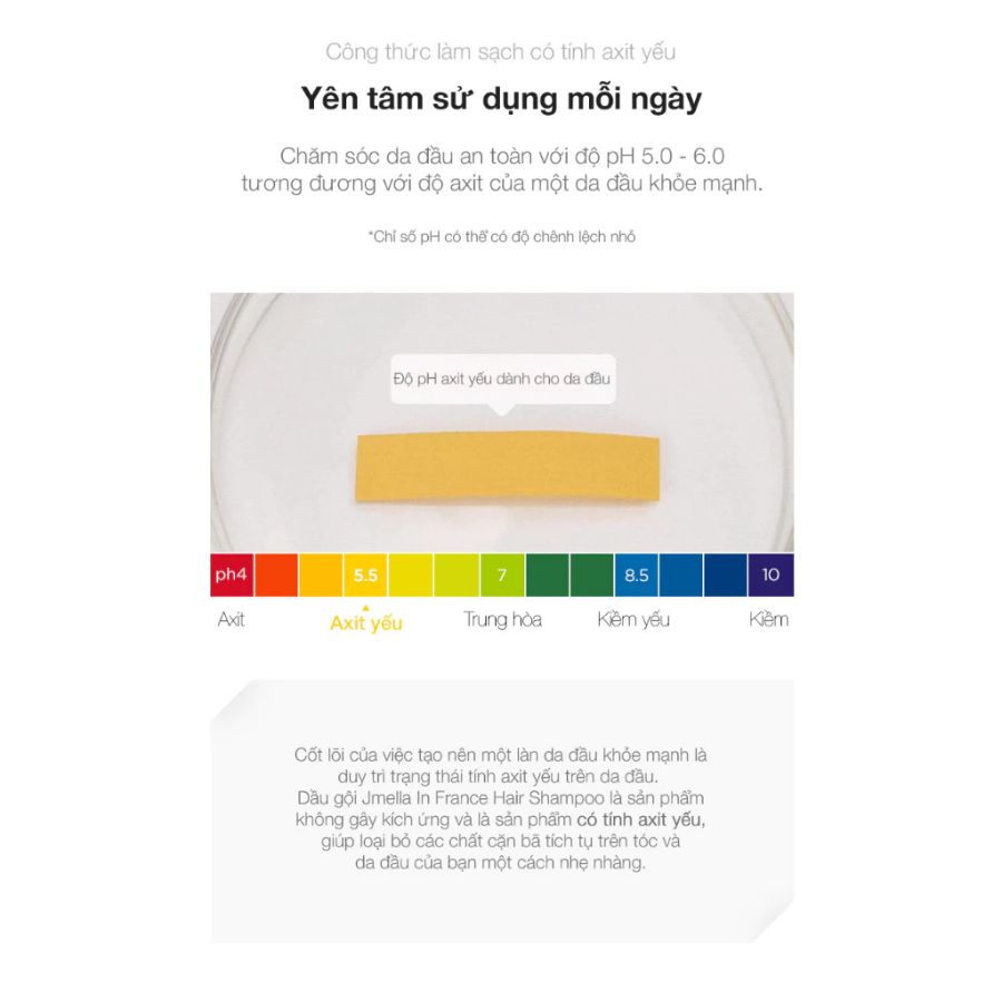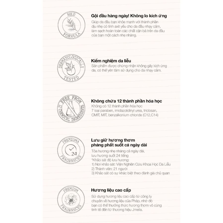 Dầu gội Jmella được chiết xuất từ các thành phần tự nhiên, dịu nhẹ, bao gồm các loại axit amin và chiết xuất thực vật như rau má, trà xanh, dâu tây, giúp nuôi dưỡng tóc từ gốc đến ngọn, đồng thời bảo vệ và làm sạch nhẹ nhàng cho da đầu nhạy cảm. Sản phẩm không chứa các hóa chất độc hại, đã qua kiểm nghiệm da liễu, mang lại mái tóc chắc khỏe, mềm mượt và lưu giữ hương thơm quyến rũ trong suốt 24 giờ.