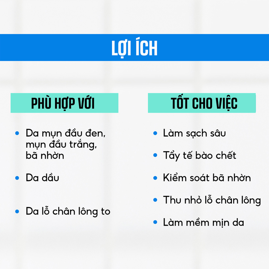 Bên cạnh đó, công thức dịu nhẹ với Cypress Water và chiết xuất từ tràm trà, cây xô thơm giúp làm dịu da, hạn chế kích ứng và kháng viêm tự nhiên. Thành phần PHA hoạt chất tẩy tế bào chết thế hệ mới, hoạt động nhẹ nhàng trên da, giúp loại bỏ lớp sừng già cỗi mà không làm khô da hay gây bong tróc, phù hợp cả với làn da nhạy cảm, da đang bị mụn.
