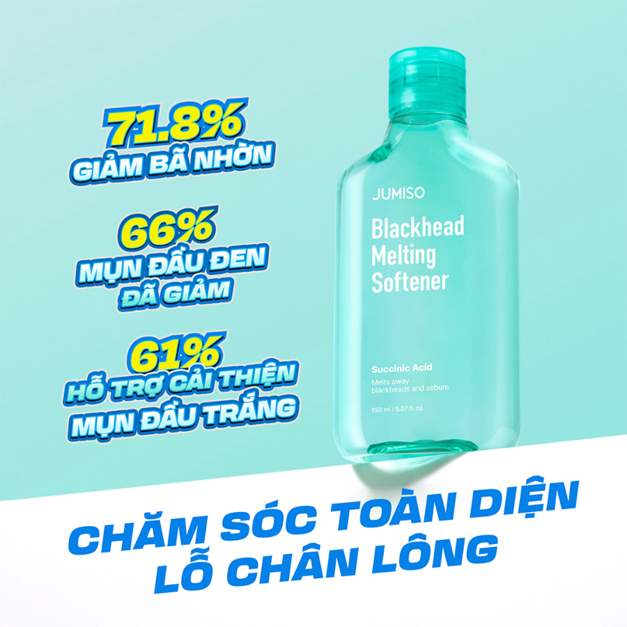 Dung dịch làm mềm mụn đầu đen Jumiso Blackhead Melting Softener là giải pháp chăm sóc da chuyên sâu đến từ thương hiệu Jumiso, Hàn Quốc. Sản phẩm giúp làm mềm nhân mụn đầu đen, mụn đầu trắng và hỗ trợ loại bỏ bã nhờn hiệu quả. Với công thức chứa Succinic Acid nổi bật, sản phẩm không chỉ giúp nới lỏng và làm tan mụn mà còn hỗ trợ làm sạch sâu lỗ chân lông, kiểm soát dầu thừa, nguyên nhân hàng đầu gây bít tắc và hình thành mụn.