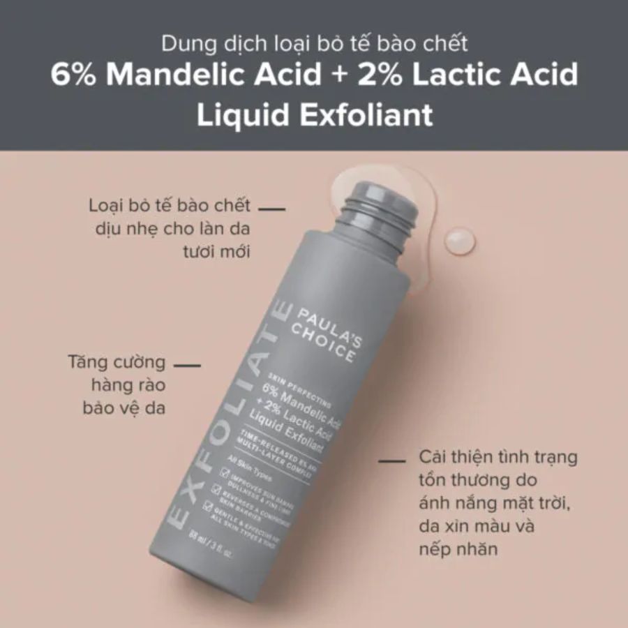 Dung dịch tẩy tế bào chết Paula's Choice 6% Mandelic Acid + 2% Lactic Acid là giải pháp hoàn hảo để loại bỏ tế bào chết một cách dịu nhẹ nhưng hiệu quả. Với công thức AHA độc đáo từ Mandelic Acid và Lactic Acid, sản phẩm giúp làm sạch da, cải thiện cấu trúc, làm sáng da, mờ nếp nhăn, mang lại làn da mịn màng và khỏe mạnh.