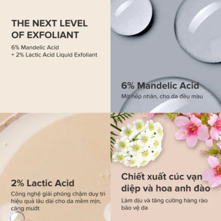 Ngoài việc loại bỏ tế bào chết, sản phẩm còn được bổ sung các chiết xuất thiên nhiên như hoa anh đào, cúc vạn diệp và ngải cứu, giúp làm dịu da, tăng cường khả năng tái tạo và củng cố hàng rào bảo vệ tự nhiên. Với độ pH tối ưu 3.0 – 4.0, sản phẩm phù hợp với mọi loại da, kể cả da nhạy cảm.