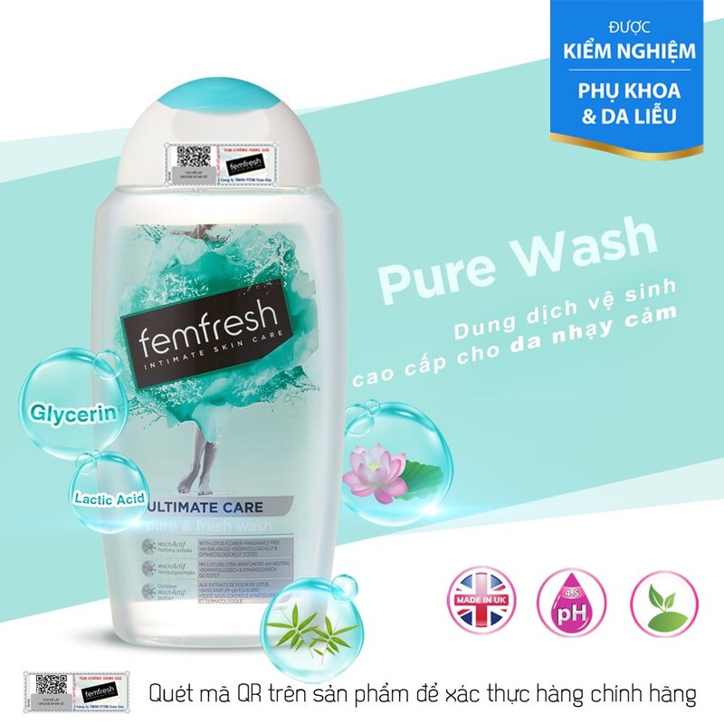 - Dung Dịch Vệ Sinh Phụ Nữ Femfresh Pure & Fresh Wash (màu xanh ngọc) có thành phần chính gồm Cúc La Mã, tinh chất hoa Sen Hồng, lá Tre Ngà, lá cây Phỉ giúp cấp ẩm sâu và nhẹ nhàng làm sạch vùng kín mỗi ngày. Sản phẩm dành cho các làn khô, thiếu ẩm, làn da nhạy cảm và dễ bị kích ứng.