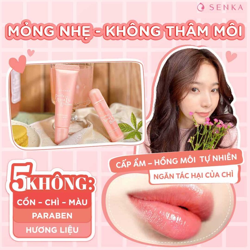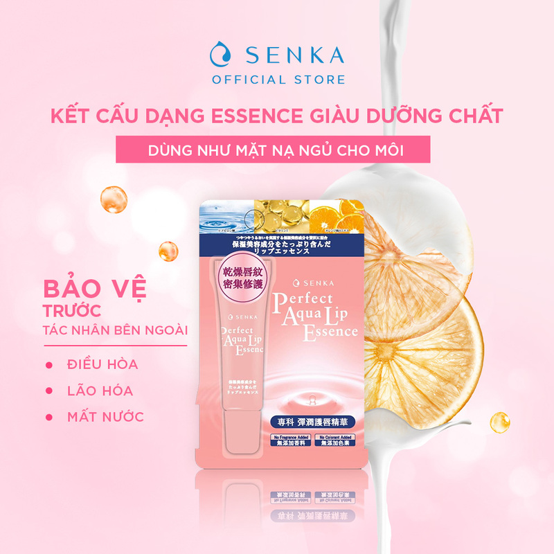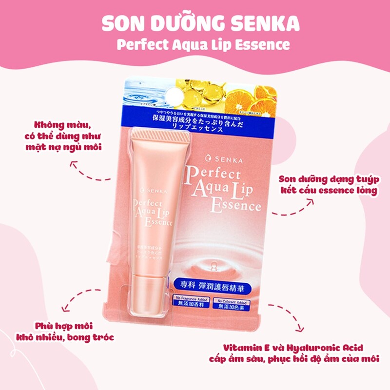 Mặt Nạ Ngủ Dưỡng Môi Cấp Ẩm Senka Perfect Aqua Lip Essence và Tinh Chất Dưỡng Môi Senka Perfect Aqua Lip Essence 10g là dòng son dưỡng đến từ thương hiệu nổi tiếng của Nhật Bản - Senka. Sản phẩm nổi bật với công thức có chứa các thành phần giàu dưỡng chất như Hyaluronic Acid, Vitamin E và chiết xuất Cam giúp hỗ trợ phục hồi độ ẩm tự nhiên cho môi. Đồng thời, các hoạt chất này cũng có khả năng giải quyết cùng lúc 5 vấn đề trên đôi môi, bao gồm: nếp nhăn - khô tróc - nứt nẻ - da chết - xỉn màu.