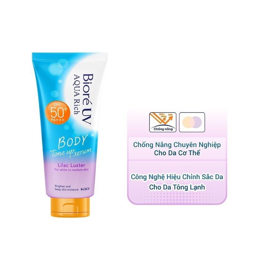 Dưỡng thể Biore UV Aqua Rich Tone Up Serum là sản phẩm chống nắng cao cấp, bảo vệ da toàn diện khỏi tia UV. Sản phẩm không chỉ chống nắng mà còn nâng tông da, giúp da sáng và đều màu nhờ công nghệ Color-correcting. Với SPF 50+ PA+++, dưỡng thể Biore ngăn ngừa da xỉn màu, đốm đen và lão hóa do tia UV.