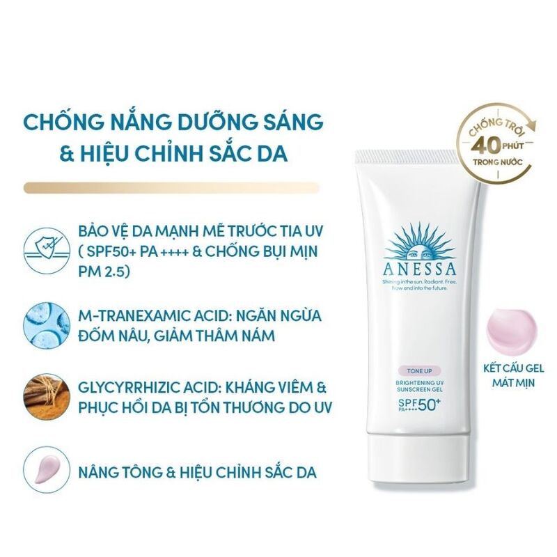 Gel Chống Nắng ANESSA Nâng Tông SPF50+ PA++++ 90g dạng sữa là kem chống nắng nâng tone, chứa nhiều thành phần dưỡng ẩm giúp da luôn mịn màng, tươi mát. Quan trọng nhất là khả năng chống nắng tối đa ngăn ngừa được tia UVA,UVB giúp da săn chắc, khoẻ mạnh.