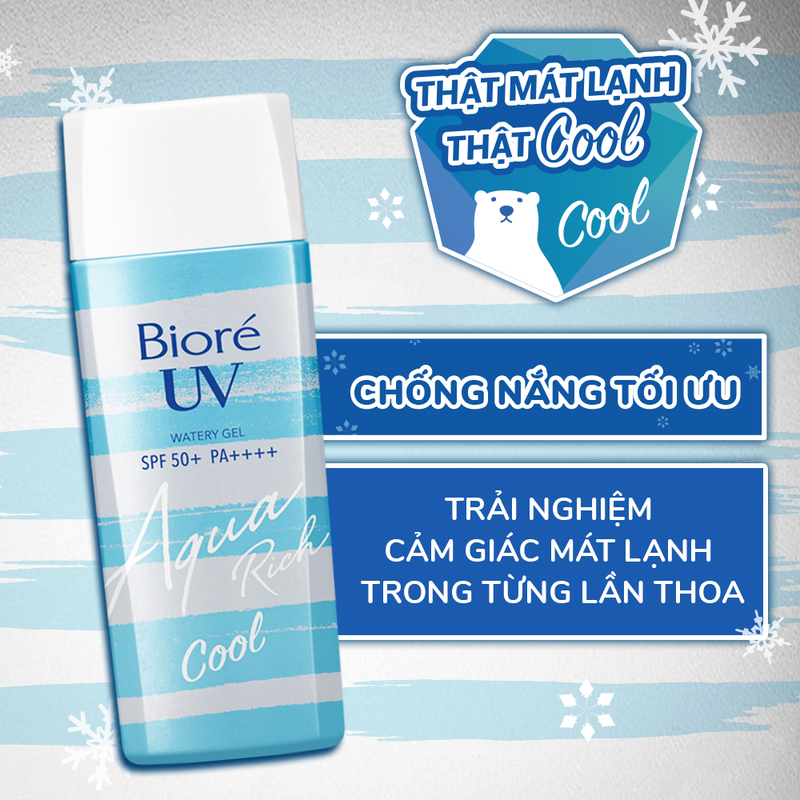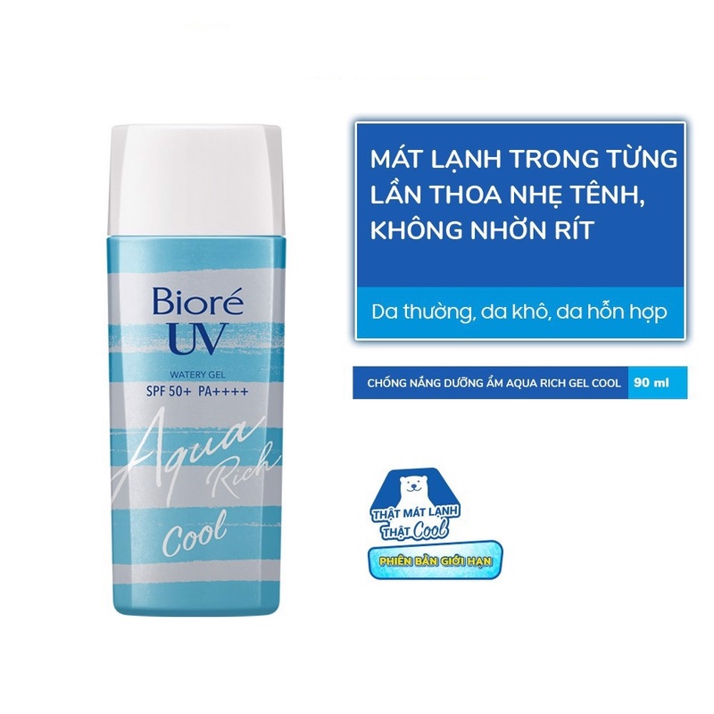 Biore UV Aqua Rich Watery Gel Cool SPF50+/PA++++ có các thành phần chính bao gồm: Sodium Hyaluronate, chiết xuất Sữa Ong Chúa, Titanium Dioxide và Butylene Glycol. Trong đó, Sodium Hyaluronate (muối của Hyaluronic Acid) và Butylene Glycol giúp dưỡng ẩm, bổ sung độ ẩm tối ưu cho da, đồng thời, tạo lớp hàng rào khóa ẩm, ngăn chặn tình trạng thoát hơi nước trên da. Chiết xuất Sữa Ong Chúa giúp kích thích sản sinh tế bào mới và collagen, chống lão hóa da. Titanium Dioxide giúp chống nắng, bảo vệ da khỏi tia UVA và UVB gây hại đến da.