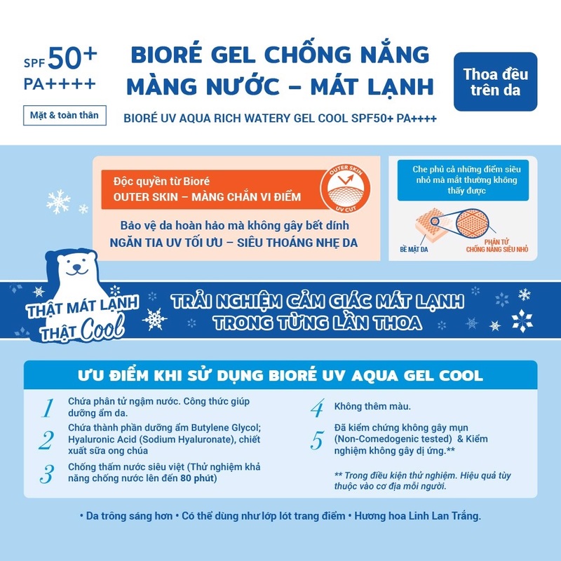 Gel Chống Nắng Biore Màng Nước Mát Lạnh 90ml là phiên bản chống nắng giới hạn đến từ thương hiệu mỹ phẩm nổi tiếng của Nhật Bản Bioré. Sản phẩm nổi bật với công nghệ độc quyền đầu tiên trên thế giới “Micro Defense Formulation” chứa những phân tử chống nắng siêu nhỏ, giúp chống nắng, đồng thời dưỡng ẩm cho da, che phủ hoàn hảo đến từng chấm nhỏ trên da. Thêm vào đó, màng chắn vi điểm Outer Skin đem đến lớp chống nắng siêu thoáng nhẹ da, không gây nặng mặt, tạo hàng rào ngăn cản tia UV tối ưu.