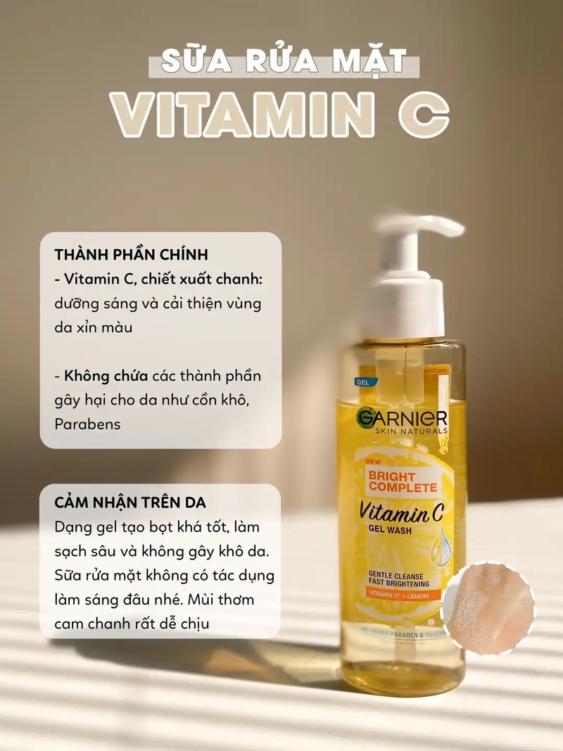 Garnier Skin Naturals Bright Complete Vitamin C Gel Wash có kết cấu dạng gel, tạo bọt mịn dày đặc, giúp làm sạch da nhẹ nhàng mà vẫn hiệu quả, không làm khô da, không làm ảnh hưởng đến lớp hàng rào bảo vệ da. Sản phẩm sử dụng công thức không chứa cồn, không chứa paraben, không chứa silicone.
