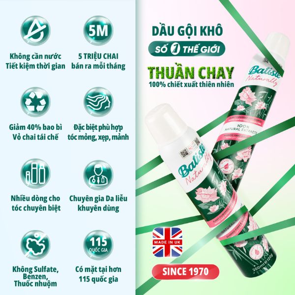 Đặc biệt, Dầu Gội Khô Batiste không chứa thuốc nhuộm và sunfat, những chất có thể gây hại cho tóc và da đầu, đảm bảo an toàn tuyệt đối. Là sản phẩm thuần chay, Batiste sử dụng các chiết xuất từ thực vật và không thử nghiệm trên động vật, bảo vệ cả người dùng lẫn môi trường.