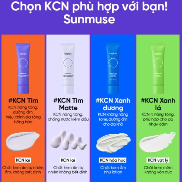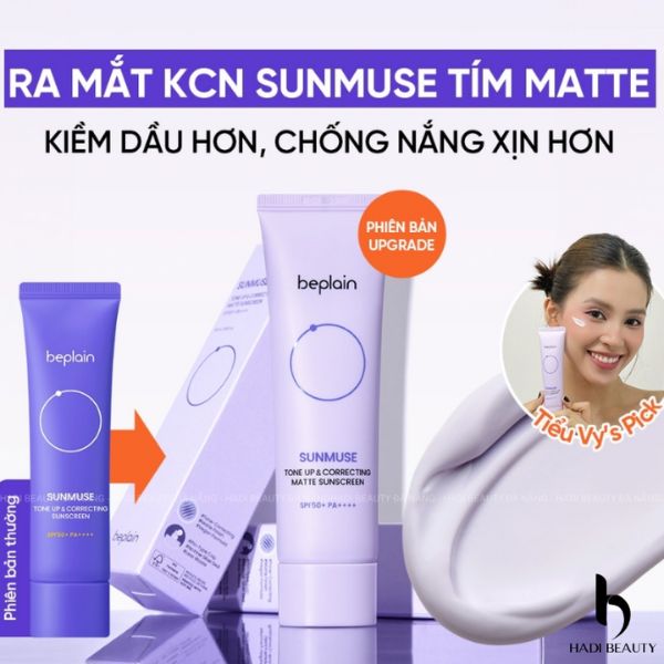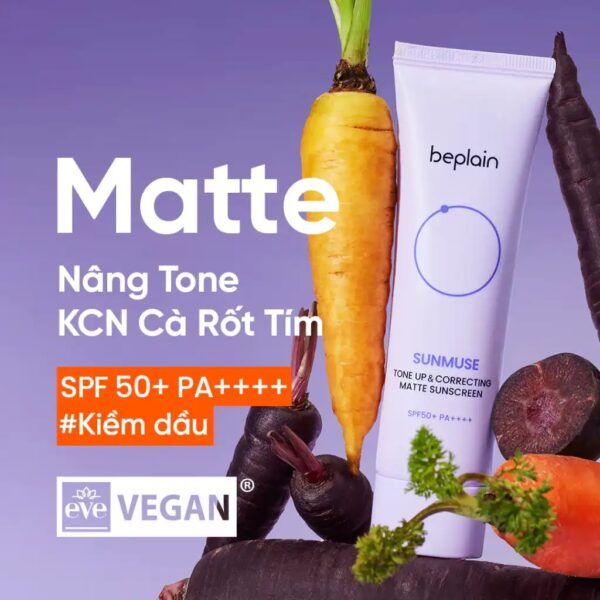 Kem Chống Nắng Beplain Sunmuse Tone Up & Correcting Matte Sunscreen SPF50+ PA++++ (Tím Nhạt) là sản phẩm kem chống nắng đa năng, vừa bảo vệ da khỏi tác động của tia UV, vừa giúp nâng tone da nhẹ nhàng. Công thức đặc biệt với kết cấu mỏng nhẹ, thấm nhanh giúp tạo lớp nền mịn màng, phù hợp cho những ai mong muốn làn da đều màu và khô thoáng suốt cả ngày.