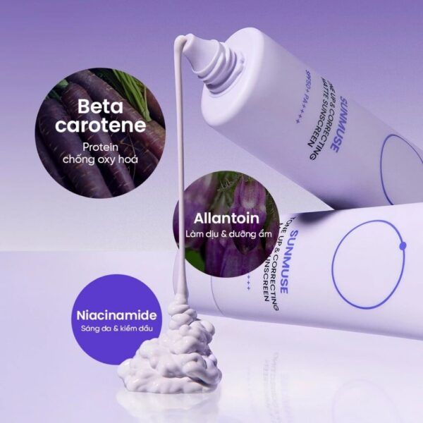 Ngoài ra, Kem Chống Nắng Beplain Sunmuse Tone Up & Correcting Matte Sunscreen SPF50+ PA++++ (Tím Nhạt) còn chứa các chiết xuất từ thực vật giúp làm dịu da, giảm thiểu kích ứng, phù hợp ngay cả với làn da nhạy cảm. Thành phần an toàn, không chứa hương liệu nhân tạo, paraben hay sulfate, giúp hạn chế nguy cơ gây mụn hoặc bít tắc lỗ chân lông.