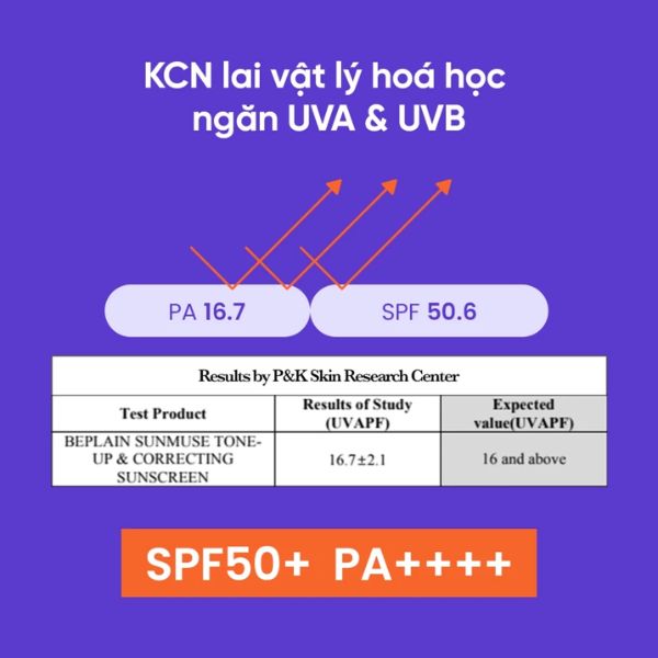 Kem Chống Nắng Beplain Sunmuse Tone Up & Correcting Sunscreen SPF50+ PA++++ (Tím) là kem chống nắng vật lý lai hoá học đến từ nhà Beplain. Sản phẩm nổi vật với chỉ số chống nắng SPF50+ PA+++ và công thức sử dụng 4 màng lọc tiên tiến gồm Tinosorb S, Uvinul T150, Uvinul A plus và Titanium Dioxide, giúp bảo vệ tối ưu khỏi tia UVA/UVB.