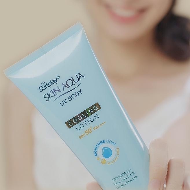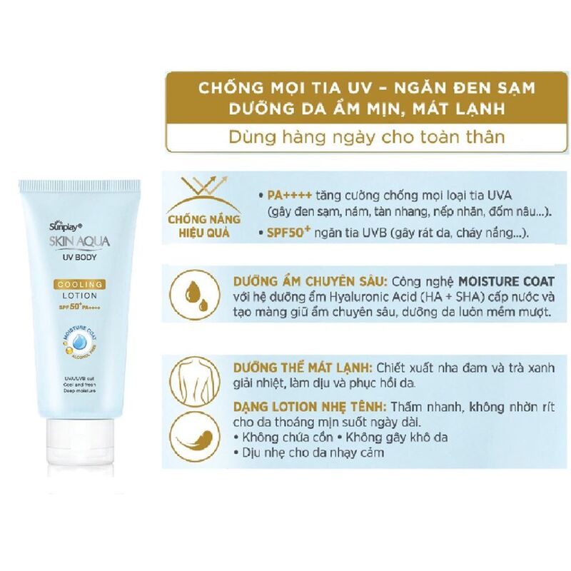 Kem Chống Nắng Dưỡng Thể Mát Lạnh Sunplay Skin Aqua UV Body Cooling Lotion đến từ thương hiệu chăm sóc da nổi tiếng của Nhật Bản Sunplay. Đây được coi là sản phẩm “giải cứu” làn da của phái đẹp trong mùa hè nóng bức này. Kem chống nắng Sunplay nổi bật với công nghệ dưỡng ẩm Moisture Coat độc quyền, kết hợp với các thành phần cấp ẩm thần thánh gồm Sodium Hyaluronate (HA) và Sodium Acetylated Hyaluronate (SHA) giúp dưỡng ẩm chuyên sâu cho da, cấp nước, khóa ẩm và hạn chế tình trạng mất nước qua da.