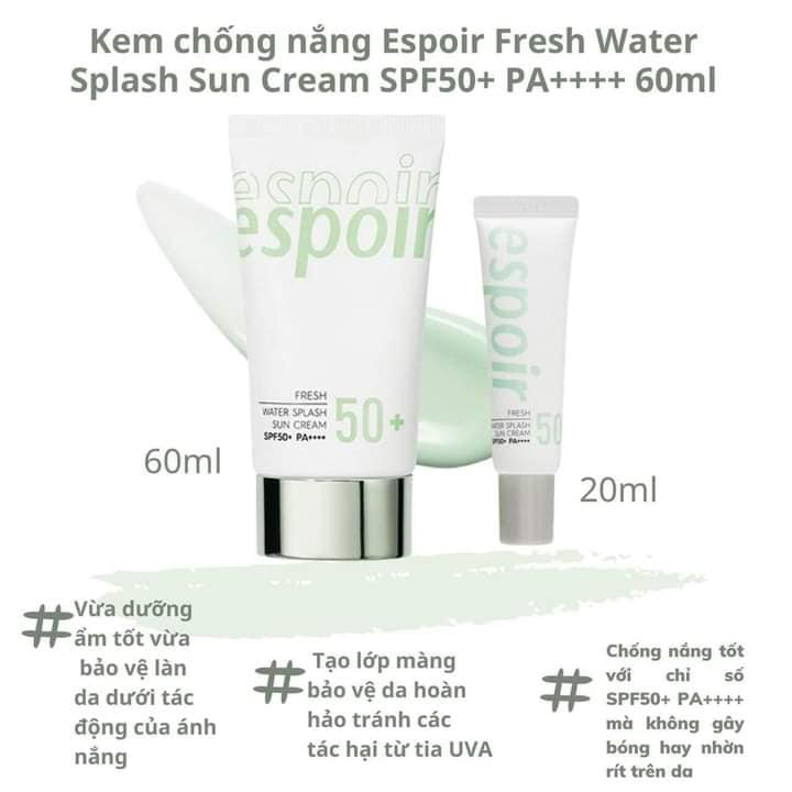 Tại Việt Nam, ngoài dòng cushion đình đám thì Espoir còn khiến chị em chao đảo bởi Kem Chống Nắng Espoir Water Splash Sun Cream SPF50+ PA+++. Với thành phần chứa Niacinamide và Glycerin, sản phẩm chống nắng nhà Espoir không chỉ đem lại hiệu quả chống nắng tuyệt vời mà còn giúp nàng bổ sung dưỡng chất, độ ẩm nuôi dưỡng làn da mềm mại, mịn màng tận sâu bên trong, ngăn ngừa các dấu hiệu lão hoá, kích ứng và cháy nắng.