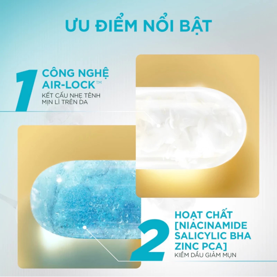 Kem có kết cấu mịn màng, nhẹ tênh, dễ dàng thẩm thấu vào da mà không gây bí hay nhờn rít. Đặc biệt, sản phẩm được áp dụng công nghệ Air-Lock, giúp ngăn ngừa việc tạo nhân mụn, mang đến cảm giác thông thoáng cho da.