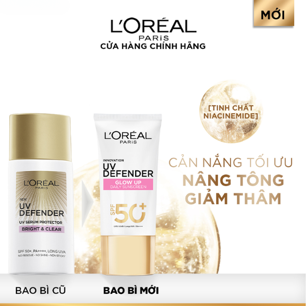 Kem Chống Nắng L'OREAL Nâng Tông Giảm Thâm UV Defender Bright & Clear 50ml là sản phẩm chống nắng đang được yêu thích với thành phần chính là Niacinamide giúp nâng tông, giảm thâm nám trên da.