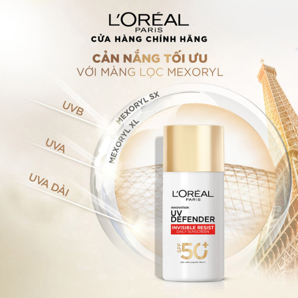 Kem chống nắng L'Oreal Paris UV Defender Serum Invisible Fluid mỏng nhẹ 50ml là một sản phẩm chống nắng đa năng, sử dụng công nghệ Netlock độc quyền của L'Oreal, tạo lớp màng chắn UV mỏng nhẹ vô hình trên da, bảo vệ da khỏi tác động của tia UV. Đặc biệt, sản phẩm chống lại tia UVA xâm nhập sâu trong da, bao gồm cả tia UVA dài có bước sóng từ 380nm - 400nm, ngăn ngừa tác động gây lão hóa sớm, đốm nâu, thâm sạm và da xỉn màu do tia UV gây ra.
