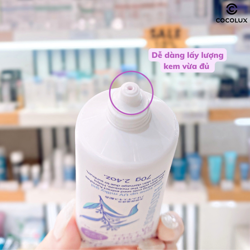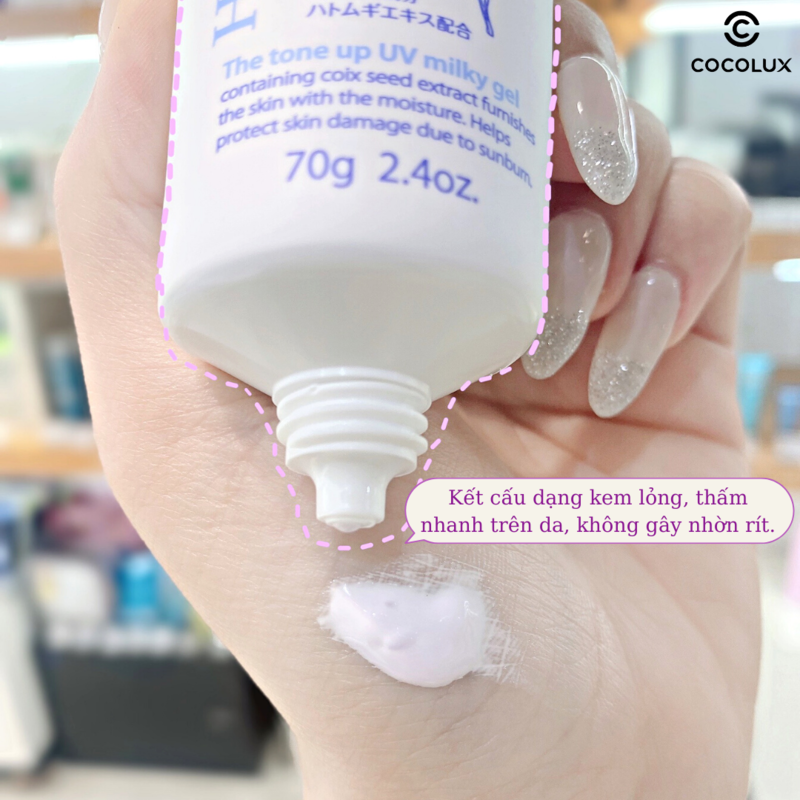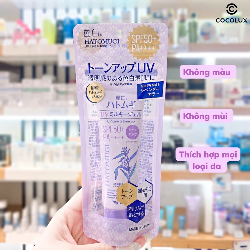 Kem chống nắng Hatomugi có kết cấu dạng kem lỏng, chứa các hạt phấn siêu mịn, có khả năng thẩm thấu nhanh, cho hiệu quả làm sáng da nhanh chóng, không gây nhờn rít hay làm bít tắc lỗ chân lông. Sản phẩm có chỉ số chống nắng cao, lên đến SPF50+ PA++++ giúp chống nắng tối ưu, bảo vệ da trước tia UVA và UVB một cách toàn diện. Hatomugi The Tone Up UV Milky Gel chứa các thành phần lành tính, an toàn cho da, không gây kích ứng, vì thế, phù hợp sử dụng trên mọi làn da, kể cả da nhạy cảm.