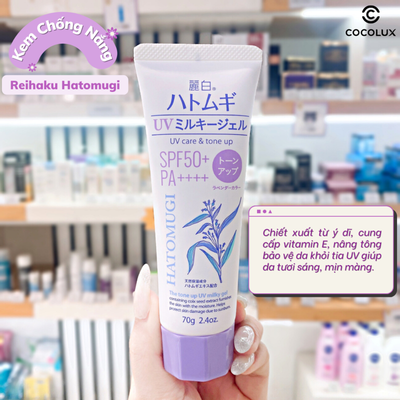 Kem Chống Nắng Nâng Tone Reihaku Hatomugi nổi bật với thành phần chính chiết xuất hạt Ý Dĩ, là một thành phần giàu công dụng dưỡng da, trong đó, công dụng nổi bật nhất chính là khả năng cung cấp Vitamin E, giúp nâng tone, làm sáng da, bảo vệ da khỏi tia UV gây hại từ ánh nắng mặt trời. Thêm vào đó, các thành phần chiết xuất tự nhiên như lá Hương Thảo, lá Đào, dầu quả Yuzu, dầu Cọ Dừa,.. giúp làm dịu, giảm kích ứng da, dưỡng ẩm chuyên sâu, chống lão hóa, cho da căng bóng, mềm mượt.