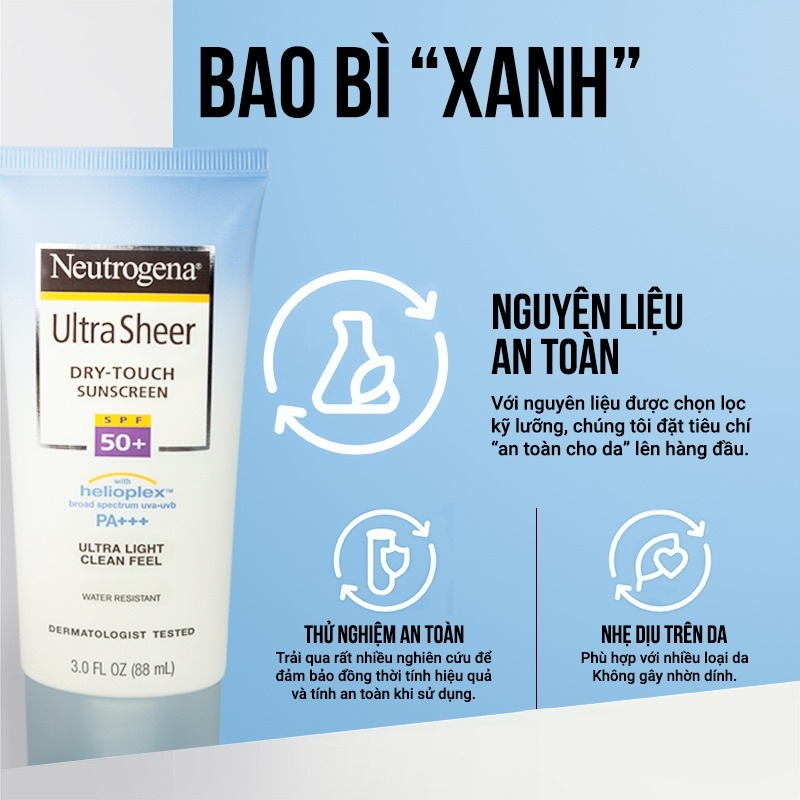 Kem chống nắng Neutrogena Ultra Sheer Dry Touch SPF 50 88ml phù hợp với mọi loại da, có thể dùng cho cả da mặt hoặc da body. Sản phẩm không dầu và không PABA, không gây kích ứng da, an toàn, lành tính. Không những thế, với khả năng hỗ trợ trị mụn, trị thâm sau mụn và dưỡng ẩm cho da hiệu quả, sản phẩm hứa hẹn sẽ còn khuấy đảo thị trường làm đẹp trong thời gian tới.