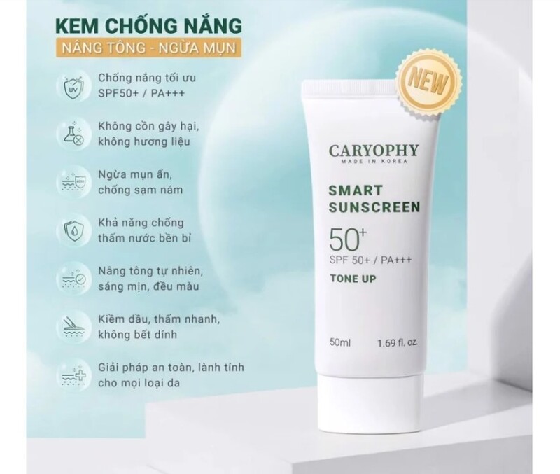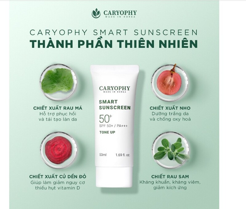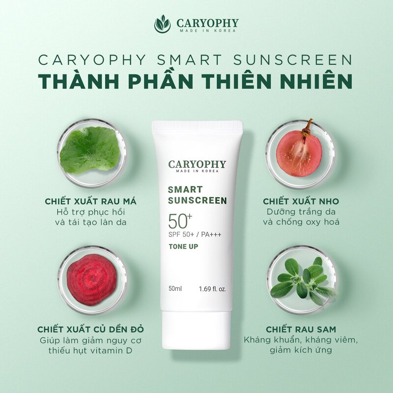 Kem Chống Nắng Ngừa Mụn Caryophy Smart Tone Up 50ml được kết hợp từ các thành phần thiên nhiên, phù hợp với mọi loại da, chỉ số chống nắng SPF50+/PA+++ giúp bảo vệ da trước tác hại của tia UVA và UVB. Ngoài ra, sản phẩm còn chứa tinh chất Multi Moist CLR, có khả năng làm giảm nguy cơ thiếu hụt Vitamin D. Có thể nói, đây chính là “chân ái” cho những chị em mong muốn sở hữu làn da trắng sáng, không mụn và mềm mịn!