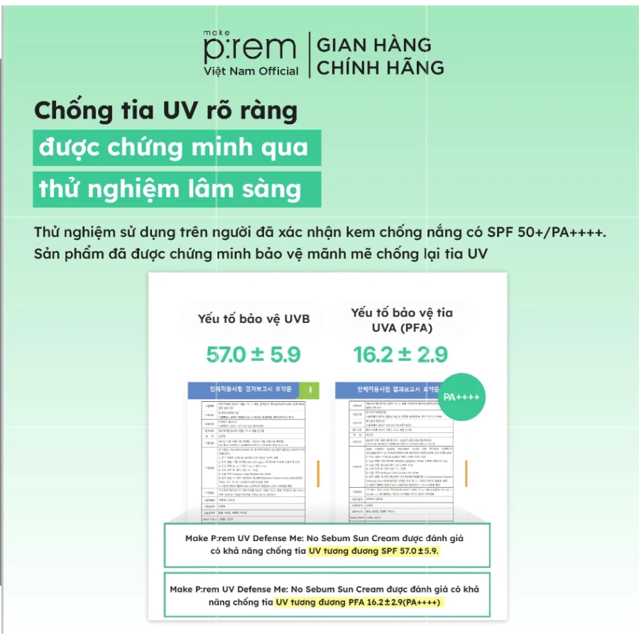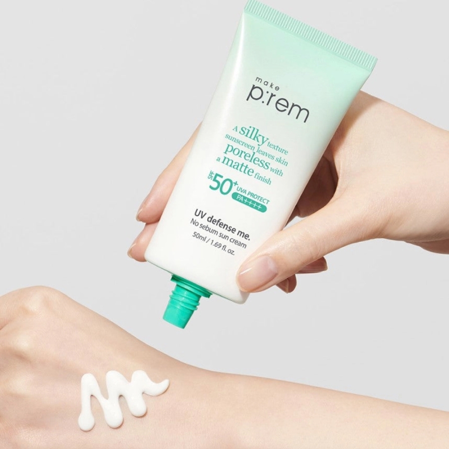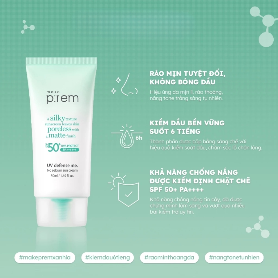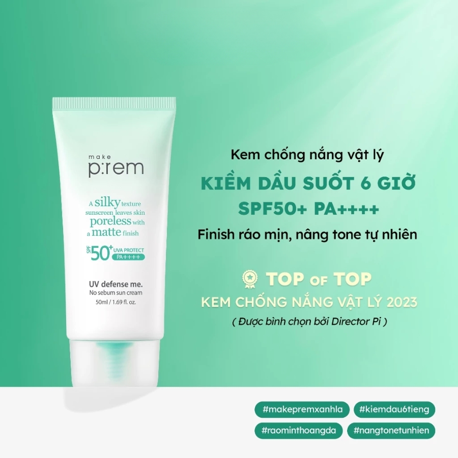 Kem Chống Nắng No Sebum Sun Cream Make P:rem Kiềm Dầu 6H SPF 50+ PA++++ - 50ml là một sản phẩm chống nắng vật lý đến từ thương hiệu Make P:rem của Hàn Quốc. Sản phẩm được thiết kế đặc biệt để đáp ứng nhu cầu của làn da hỗn hợp đến da dầu, với khả năng kiểm soát bã nhờn vượt trội, giúp da luôn khô thoáng, không bóng dầu trong nhiều giờ.