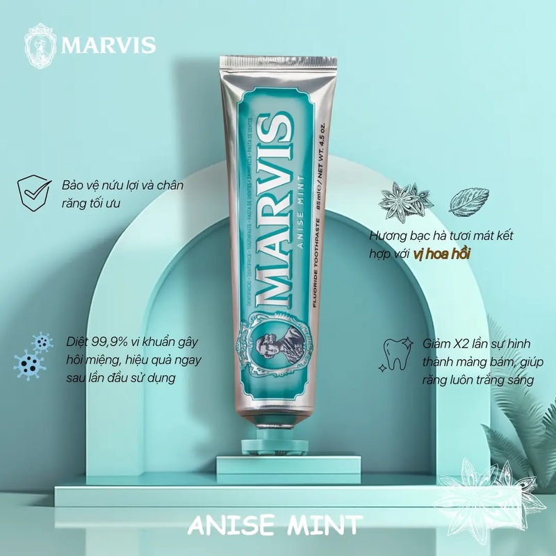 Kem đánh răng Marvis chứa hai thành phần chính là silica và nhôm hydroxit (aluminium hydroxide), có vai trò quan trọng trong việc loại bỏ mảng bám trên răng. Đặc biệt, hai thành phần này đã được Marvis nghiên cứu kỹ lưỡng, đảm bảo không gây hại cho nướu và lớp men răng. Nhờ vào sự kết hợp này, răng của bạn sẽ ngày càng trắng sáng hơn sau mỗi lần sử dụng.