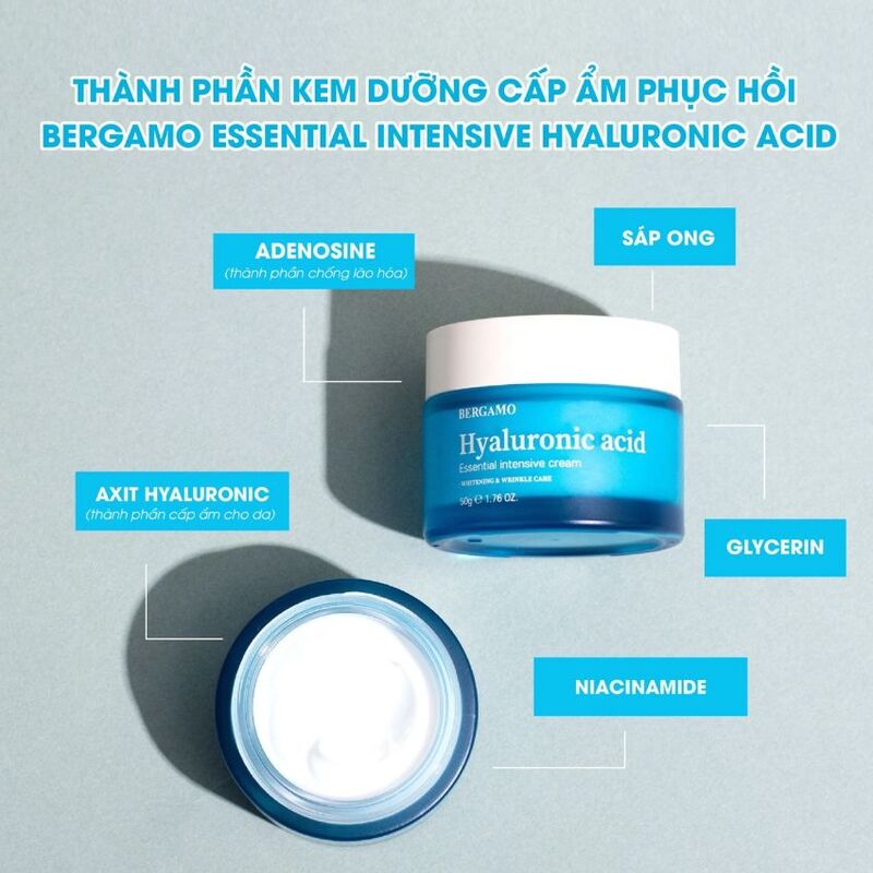 Kem Dưỡng Bergamo Cấp Ẩm Phục Hồi Hyaluronic Acid Essential Intensive 50g là một sản phẩm chăm sóc da chất lượng cao đến từ thương hiệu Bergamo, Hàn Quốc, được đánh giá cao trong việc cung cấp và duy trì độ ẩm cho làn da. Với sự kết hợp hoàn hảo của các thành phần như Axit Hyaluronic, Niacinamide, Sáp Ong, Adenosine và Glycerin, sản phẩm này không chỉ giúp bổ sung độ ẩm, làm dịu, nuôi dưỡng làn da mà còn chống lại các dấu hiệu của lão hóa da và tăng cường độ đàn hồi cho làn da.
