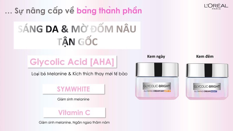 Dòng sản phẩm L’Oreal Glycolic-Bright được lấy ý tưởng từ liệu pháp peel da hoá học, tác động trực tiếp vào 4 khía cạnh làm sáng da bao gồm: giảm thâm nám, đốm sậm màu, giảm khuyết điểm, làm da đều màu và cấp ẩm giúp da rạng rỡ hơn. Thành phần Vitamin E & C nguyên chất có trong các hạt nhỏ liti của kem dưỡng có khả năng thẩm thấu sâu dưới da, chống oxy hóa và thúc đẩy quá trình tái tạo da mới hoàn hảo.