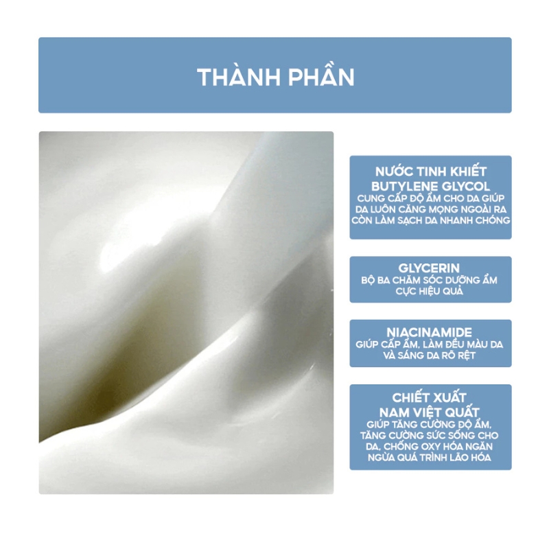 - Niacinamide: Cấp ẩm, làm đều màu da và sáng da.