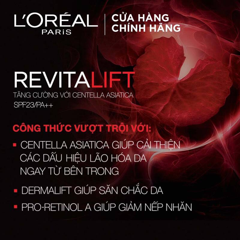 Kem dưỡng Loreal săn chắc & giảm nếp nhăn Revitalift ngày đến từ thương hiệu mỹ phẩm hàng đầu nước Pháp L’Oreal. Sản phẩm thuộc dòng Revitalift, nổi bật với việc sử dụng công nghệ Dermalift độc quyền giúp làm săn chắc da. Phức hợp Pro-Retinol A giúp làm giảm nếp nhăn trên da. Chiết xuất rau má tự nhiên giúp làm mát và dịu da, chống lão hóa da từ sâu bên trong. Kem dưỡng Loreal có chỉ số chống nắng SPF23 PA++ giúp chống nắng, bảo vệ da khỏi tia UVA và UVB gây hại từ ánh nắng mặt trời.
