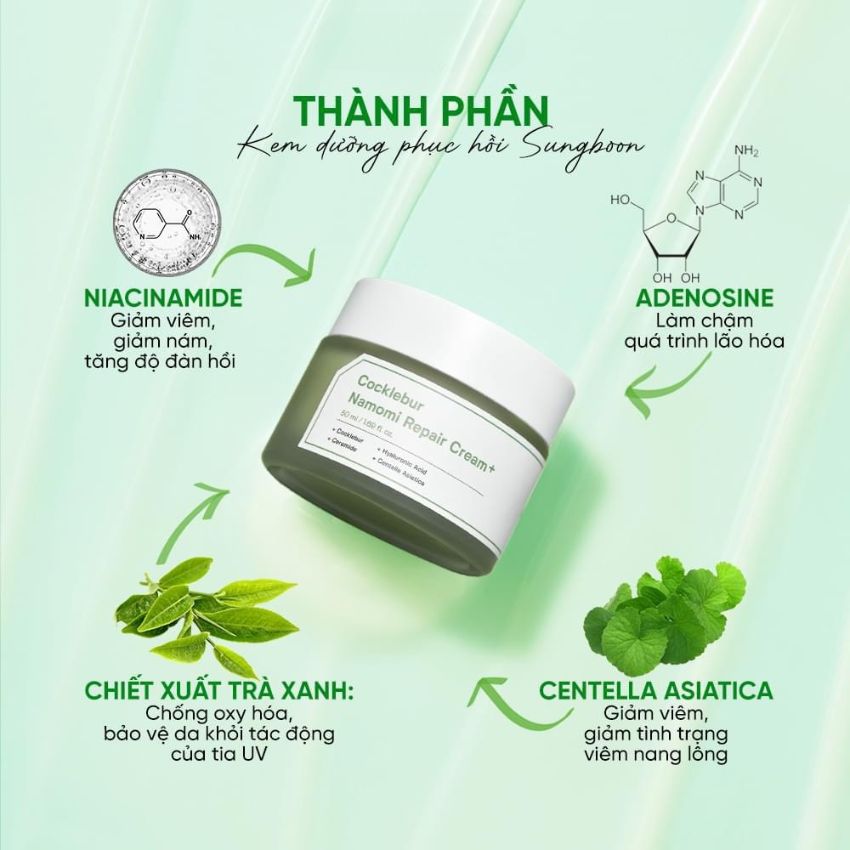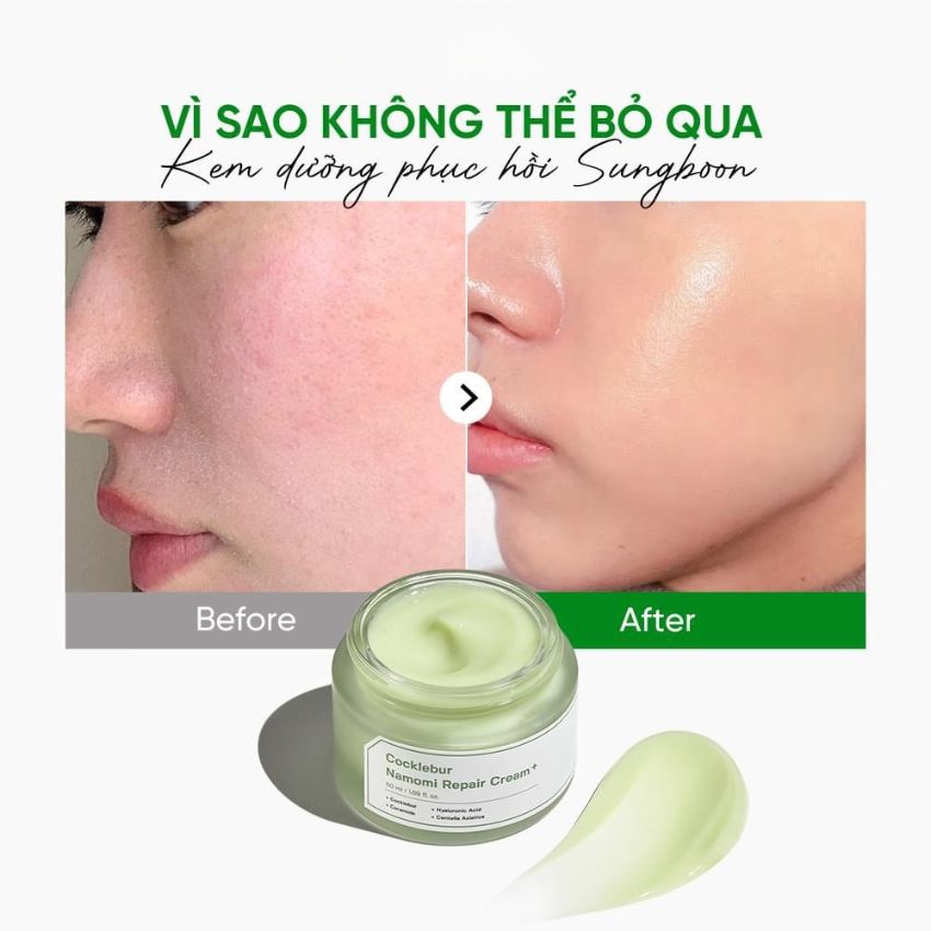 Kem dưỡng Sungboon Cocklebur Namomi Repair Cream 50ml là sản phẩm cao cấp từ Sungboon Editor, chuyên biệt cho việc phục hồi và dưỡng da. Với công thức độc quyền kết hợp các thành phần thiên nhiên, sản phẩm giúp làm dịu da nhạy cảm, giảm viêm và cung cấp độ ẩm sâu, mang lại làn da mềm mại, mịn màng. Các loại acid lành tính trong kem hỗ trợ tái tạo và củng cố hàng rào bảo vệ da, giúp da khỏe mạnh từ bên trong.