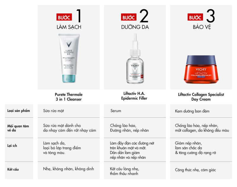 Kem Dưỡng Vichy Collagen Ban Đêm 50ml đến từ thương hiệu chăm sóc da hàng đầu nước Pháp Vichy. Sản phẩm nổi bật với các thành phần giàu công dụng dưỡng da, bao gồm: nước khoáng núi lửa Vichy, Vitamin CG, Bio-Peptide và Resveratrol. Trong đó, nước khoáng Vichy độc quyền được lấy từ núi lửa, giúp tăng sức đề kháng cho da, củng cố lớp hàng rào bảo vệ da. Vitamin CG là một dẫn xuất mạnh của Vitamin C, có công dụng làm trắng da, tăng cường khả năng phục hồi biểu bì. Phức hợp Bio-Peptide là một chuỗi từ 3-5 acid amin kích hoạt nguyên bào sợi, giúp kích thích sản sinh Collagen và Hyaluronic Acid trên da. Resveratrol có khả năng làm sáng da, chống gốc oxy hóa tự do.