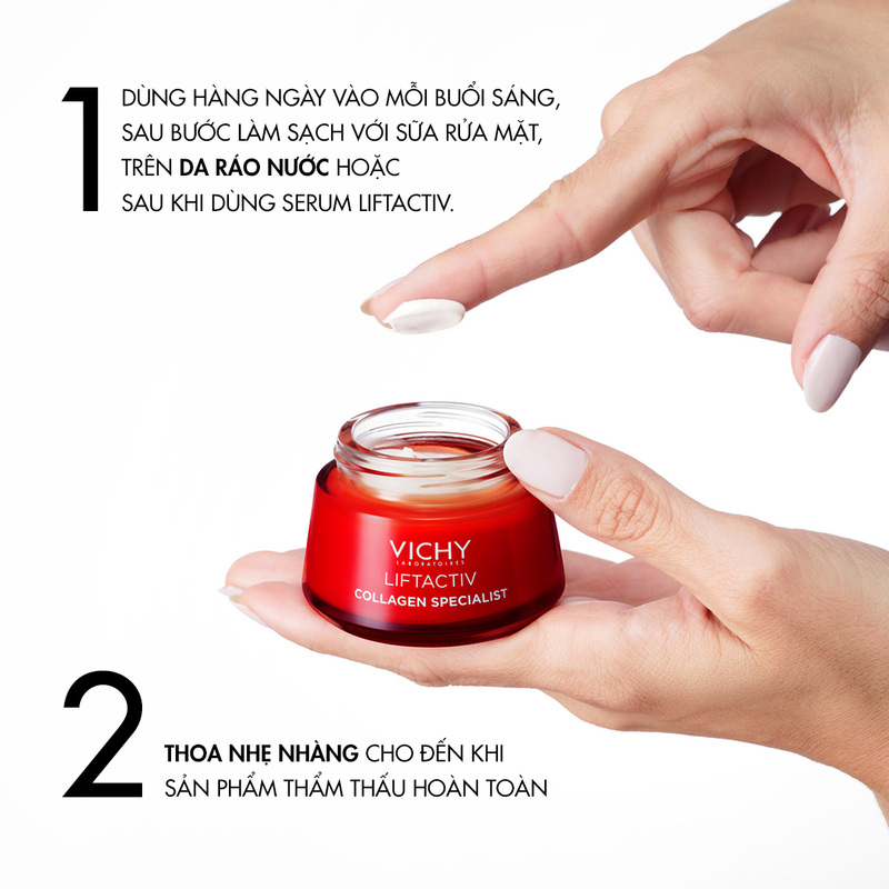 Sản phẩm có kết cấu mỏng nhẹ, dễ dàng thẩm thấu trên da khi apply, không gây nhờn rít. Sau khi sử dụng lần đầu tiên, kem dưỡng giúp da căng mịn hơn ngay lập tức 10%, giúp da săn chắc hơn 20,6%. Kem dưỡng Vichy Collagen Liftactiv Collagen Specialist Chuyên Biệt 50ml không chứa paraben, không chất bảo quản. Các thành phần an toàn, lành tính đã được các bác sĩ da liễu chứng nhận. Sản phẩm phù hợp với mọi loại da, kể cả da nhạy cảm.