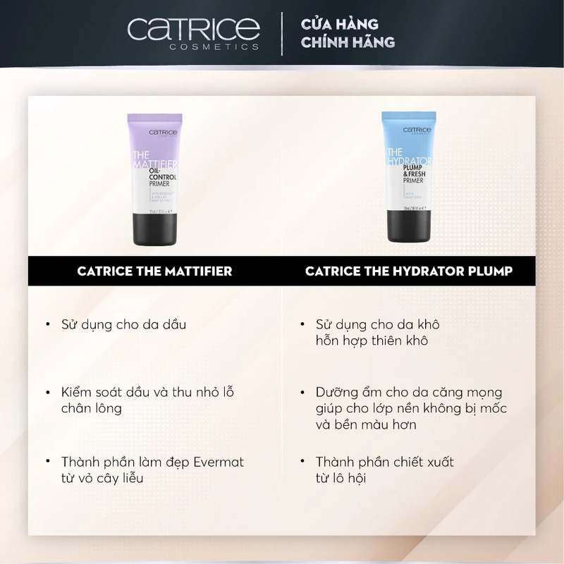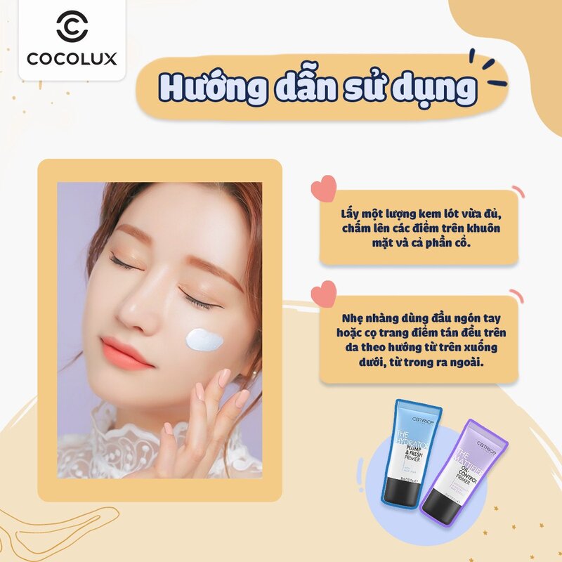 - Kem Lót Catrice Primer 30ml - Plump & Fresh (Xanh dương): Dành cho da khô, có tác dụng làm mát da