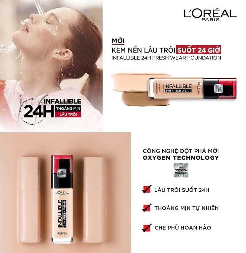 Kem nền L'Oreal Paris Infallible 24h Fresh Wear Foundation 30ml là một trong những loại kem nền khá được yêu thích trong thời gian gần đây. Đây chính là phiên bản nâng cấp của dòng Infallible. So với phiên bản cũ, sản phẩm đã được cải tiến hơn về thiết kế cũng như chất lượng mang đến nhiều ưu điểm nổi bật như công nghệ ngăn bóng dầu, chống trôi tạo nên lớp nền mịn nhẹ, che phủ tốt và bền màu suốt 24 tiếng.