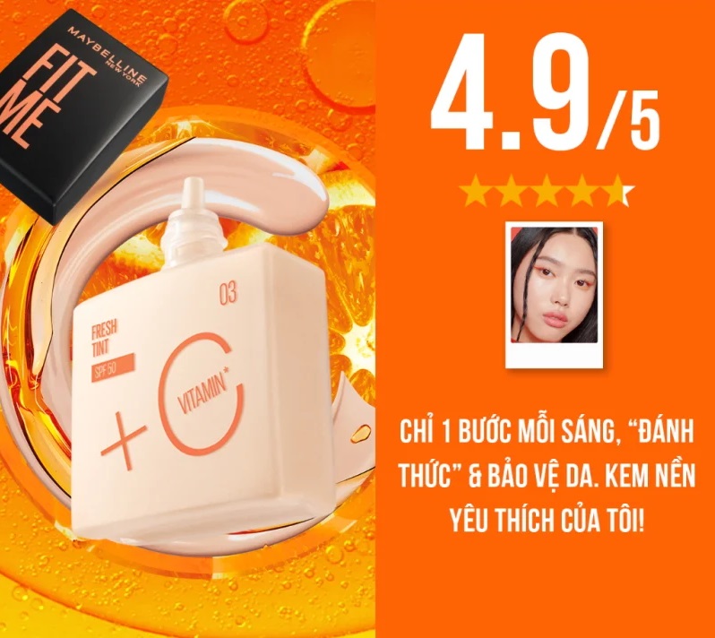 Kem Nền Maybelline Fit Me Foundation Fresh Tint SPF50 30ml nổi bật với công thức chứa thành phần vitamin C, có khả năng làm sáng và đều màu da, bảo vệ da khỏi ánh nắng mặt trời, các tác nhân gây hại bên ngoài môi trường và các gốc tự do. Chỉ số chống nắng SPF50/PA+++ giúp hạn chế các vấn đề có thể xảy ra trên da do tia cực tím gây ra.