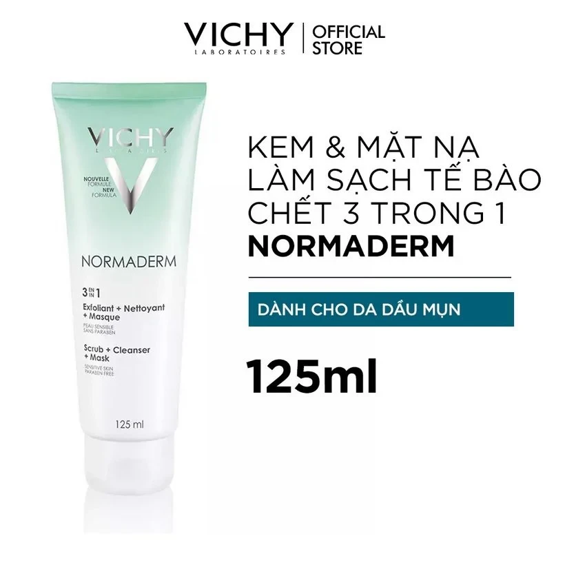 Thương hiệu Vichy đã cho ra mắt Kem Tẩy Tế Bào Chết 3 Tác Động Vichy Normaderm 3 in 1 Scrub + Cleanser + Mask 125ml là sản phẩm có công dụng 3 trong 1, giúp rửa mặt, tẩy tế bào chết và đắp mặt nạ trên da.