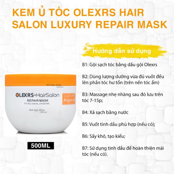 Kem Ủ Tóc Olexrs Luxury Argan Oil Organic Biotin Repair Mask 500ml là giải pháp chăm sóc tóc chuyên sâu dành cho mái tóc hư tổn, khô xơ và dễ gãy rụng. Với công thức giàu dưỡng chất từ tinh dầu Argan Oil và Collagen tự nhiên, sản phẩm giúp phục hồi cấu trúc tóc từ bên trong, mang lại mái tóc mềm mượt, óng ả và chắc khỏe hơn.