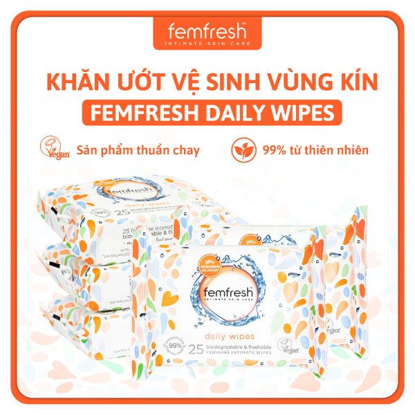 Khăn Ướt Vệ Sinh Vùng Kín Hằng Ngày Cao Cấp Femfresh 25 Tờ là giải pháp lý tưởng giúp làm sạch vùng kín một cách nhẹ nhàng, tiện lợi mà không cần dùng nước. Sản phẩm được làm từ chất liệu phân hủy sinh học, có thể tự phân hủy trong nước, thân thiện với môi trường. Với 99% thành phần có nguồn gốc tự nhiên, bao gồm chiết xuất Lô hội, hoa Cúc Kim Tiền và Acid Lactic, sản phẩm không chỉ làm sạch mà còn hỗ trợ kháng khuẩn, kháng viêm và cân bằng độ pH tự nhiên của vùng kín.