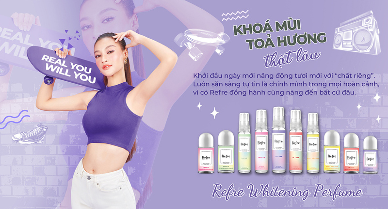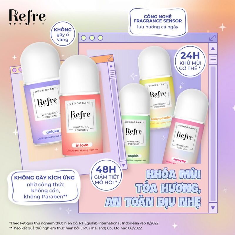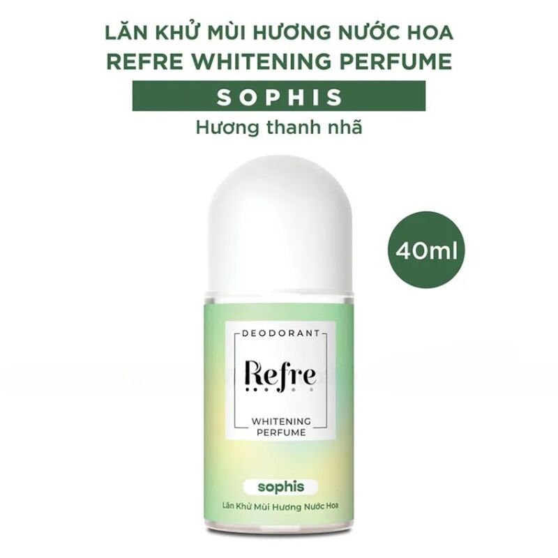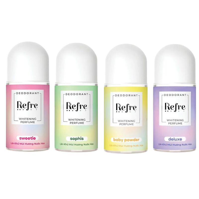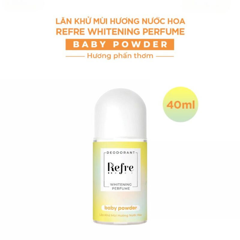- Lăn khử mùi Refre Whitening Perfume hương phấn thơm 40ml: Hương phấn thơm dễ chịu nhưng vẫn rất thanh lịch với cam bergamot, ngọc lan tây, hoa hồng, đinh hương, hoa vòi voi và xạ hương, mang lại cảm giác sạch sẽ, mềm mại.
