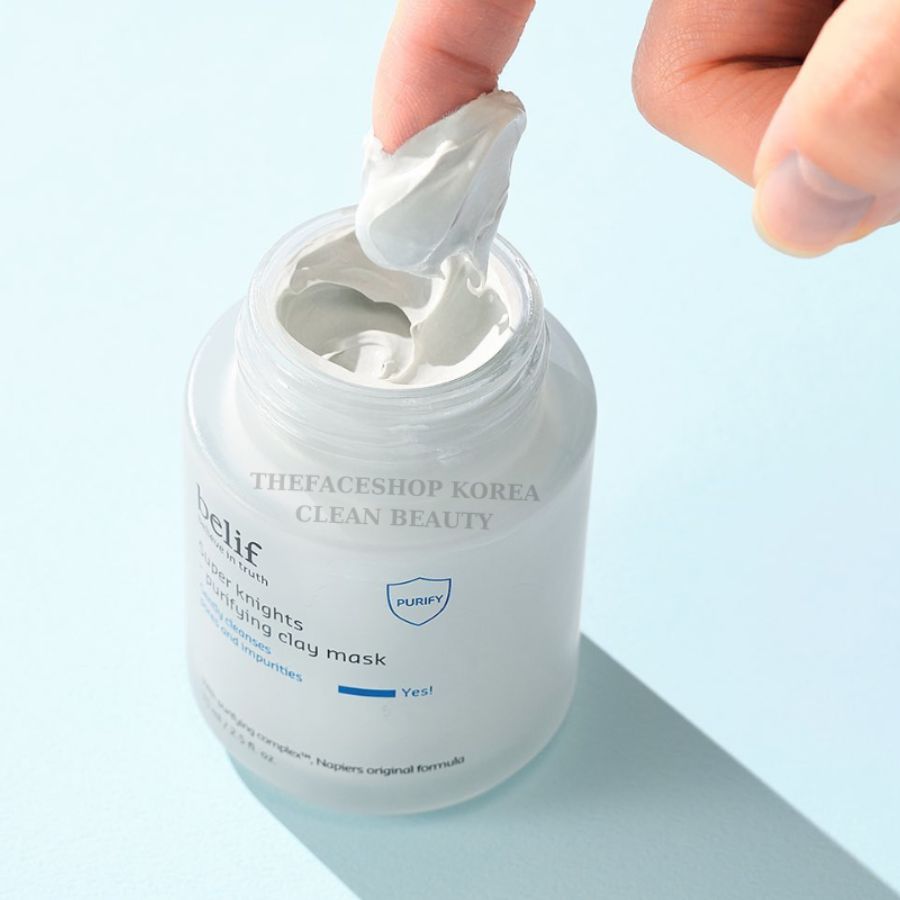 Belif Super Knights Purifying Clay Mask là dòng mặt nạ đất sét cao cấp đến từ thương hiệu dược mỹ phẩm Hàn Quốc - Belif, nổi bật với khả năng làm sạch sâu, kiểm soát dầu và thanh lọc làn da hiệu quả. Sản phẩm ứng dụng công nghệ Purifying Complex™ độc quyền kết hợp từ cây kế sữa và lá xô thơm, giúp loại bỏ tạp chất, dầu thừa và cặn bẩn tích tụ trong lỗ chân lông, nguyên nhân gây nên mụn và làn da xỉn màu.