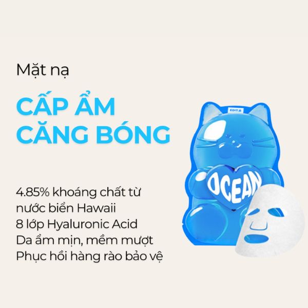 Mặt Nạ EDIT.B Waterfull Gummy Ocean Dưỡng Ẩm 25ml: Bổ sung độ ẩm sâu với nước biển Hawaii và 8 loại Hyaluronic Acid, đặc biệt phù hợp với làn da khô.