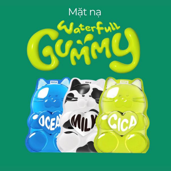 Mặt Nạ EDIT.B Waterfull Gummy là một dòng mặt nạ độc đáo với kết cấu bán gel và tinh chất jelly tươi mát, mang lại hiệu quả dưỡng ẩm sâu mà không gây kích ứng da. Với khả năng giữ ẩm vượt trội, dòng mặt nạ này đặc biệt lý tưởng cho làn da nhạy cảm nhờ công thức dịu nhẹ. Ngoài ra, Mặt Nạ EDIT.B Waterfull Gummy còn đạt chứng nhận thuần chay và thân thiện với hệ sinh thái biển, được sản xuất từ vật liệu thân thiện môi trường như hộp FSC và mực đậu nành.
