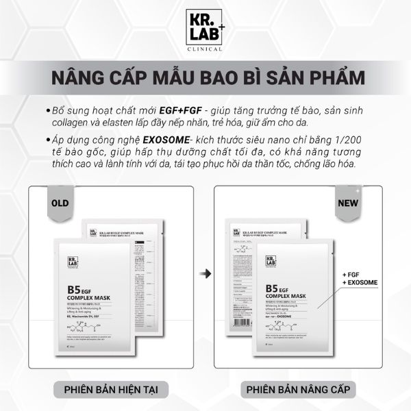 Mặt nạ Kr.Lab+ B5 EGF Complex cấp ẩm phục hồi đến từ thương hiệu mỹ phẩm Hàn Kr.Lab. Sản phẩm nổi bật với bộ đôi thành phần dưỡng da B5 và EGF+ FGF. Trong đó, B5 hay tên đầy đủ là D-Panthenol có khả năng dưỡng ẩm, kháng viêm, kháng khuẩn, cải thiện tình trạng mụn trên da, đẩy nhanh quá trình làm lành vết thương trên da, chống lão hoá.