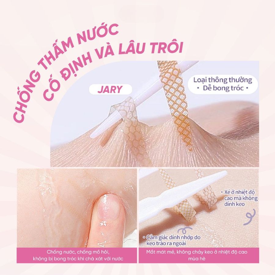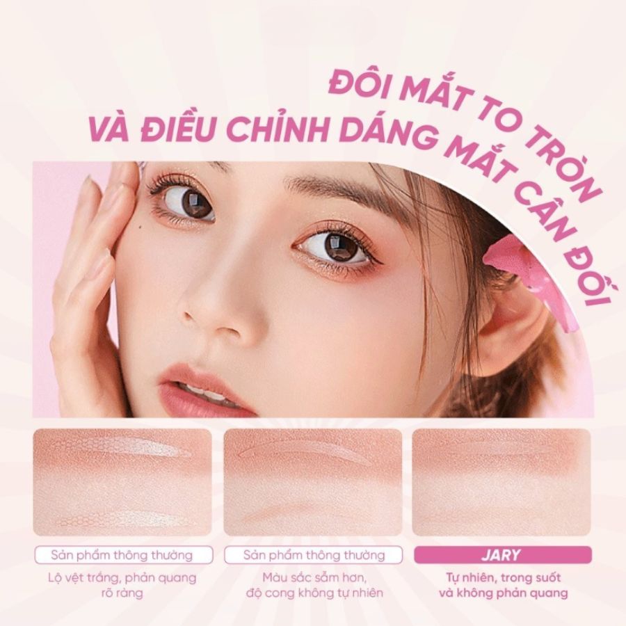 Với thiết kế mờ đục và tàng hình, miếng dán kích mí Jary không phản chiếu ánh sáng, tạo nên vẻ đẹp tự nhiên và thoải mái khi sử dụng. Sản phẩm này không chỉ mang lại đôi mắt hai mí sống động và trong suốt, mà còn có độ cong được nghiên cứu kỹ lưỡng, phù hợp với nhiều kiểu dáng mắt khác nhau.