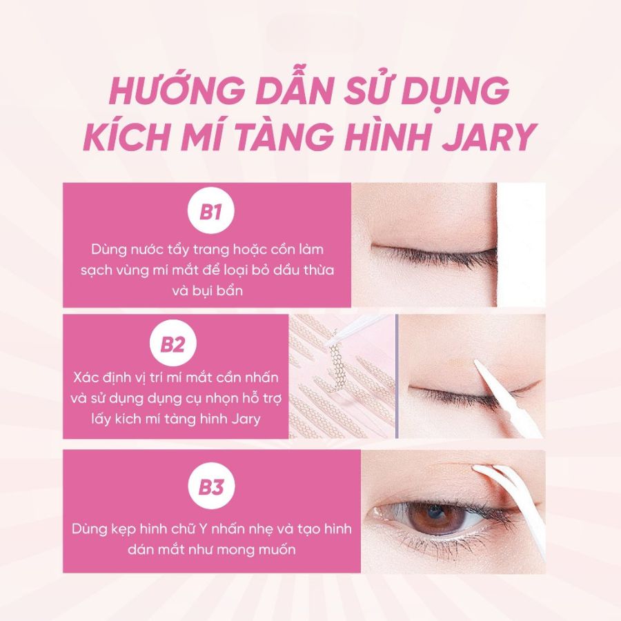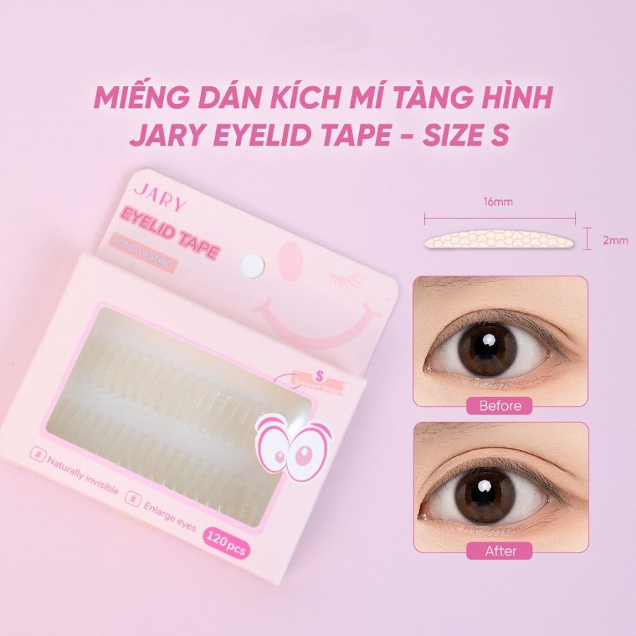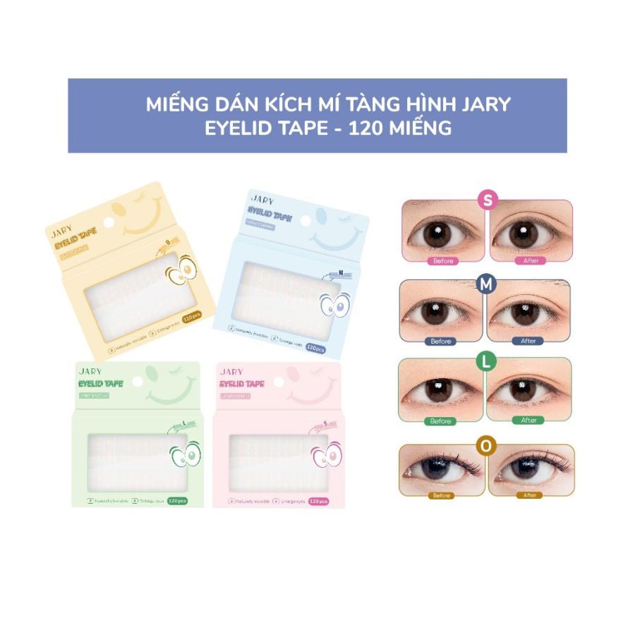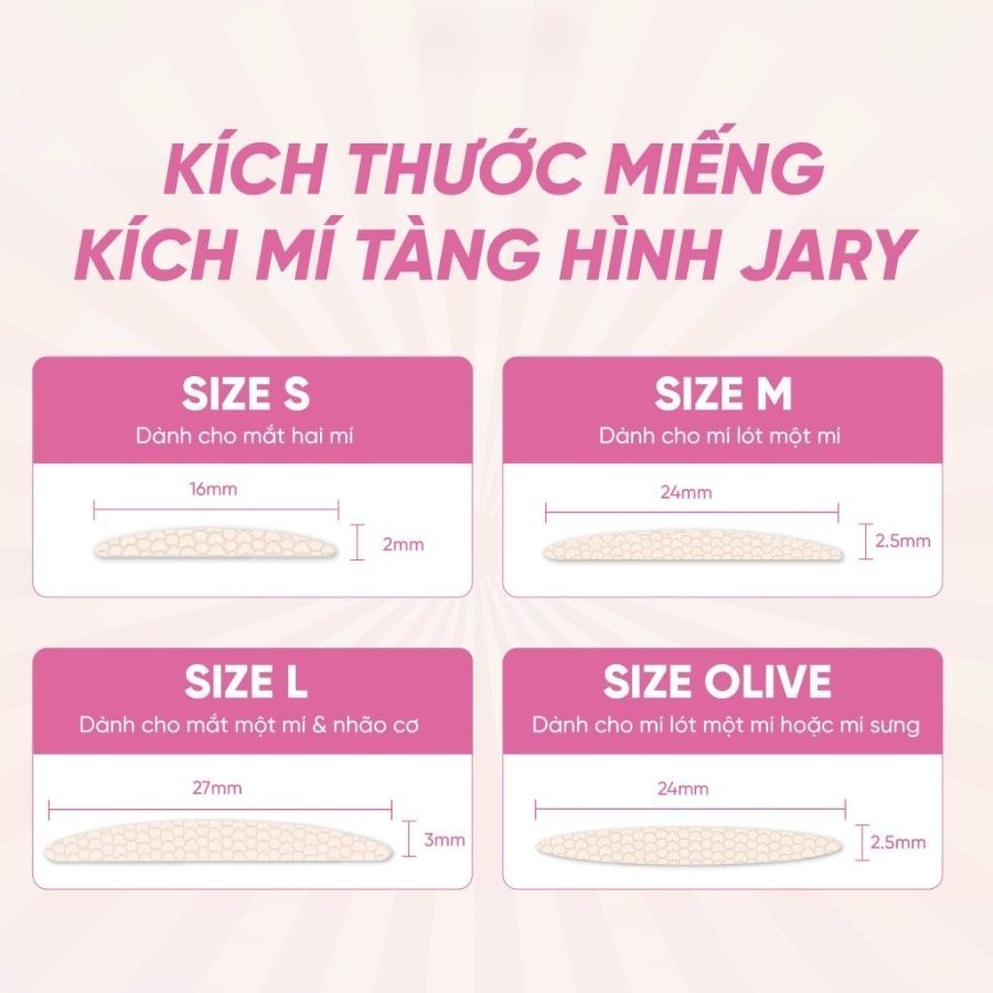 Miếng dán kích mí Jary được thiết kế với nhiều kích thước khác nhau để phù hợp với nhiều kiểu dáng mắt, bao gồm 4 size: S, M, L, O. Sản phẩm này có chất liệu mềm mại, có độ dính cao, chống nước và chống mồ hôi, giúp duy trì hiệu ứng mắt hai mí suốt cả ngày dài.