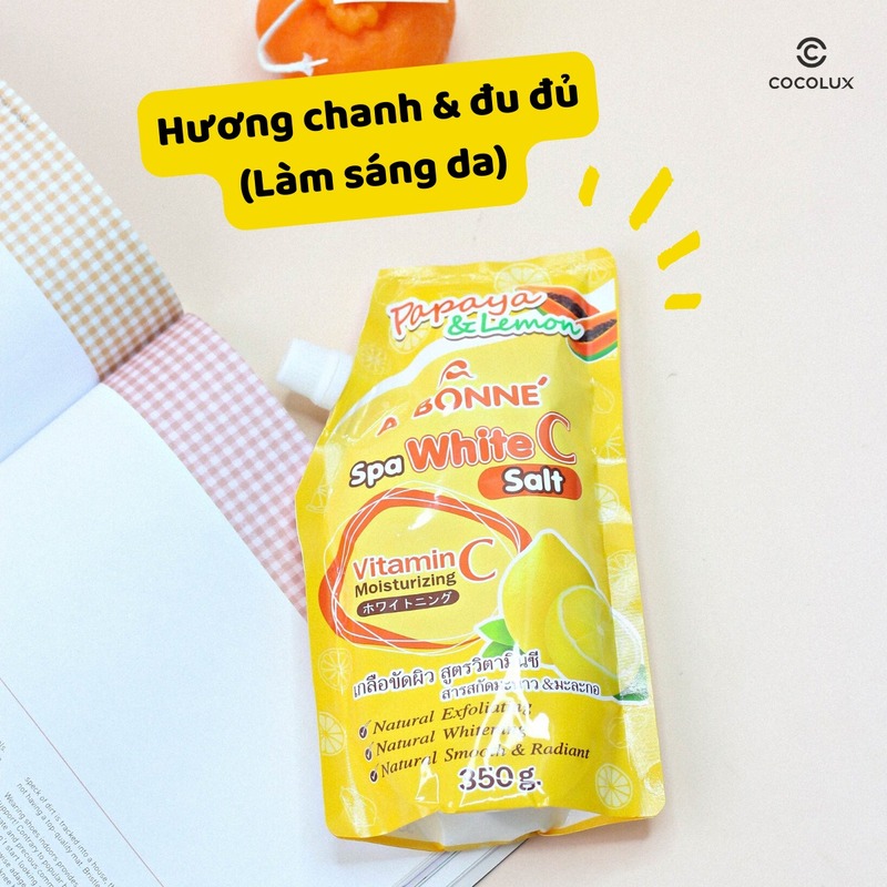 A Bonne Spa White C Salt có kết cấu dạng hạt, gồm những tinh thể muối biển li ti, giúp dễ dàng lấy đi bụi bẩn, bã nhờn, dầu thừa, tế bào chết trên da, đem lại làn da mịn màng, trắng sáng rạng rỡ. Sản phẩm chứa các thành phần lành tính, an toàn cho da, không gây kích ứng, phù hợp với mọi làn da.