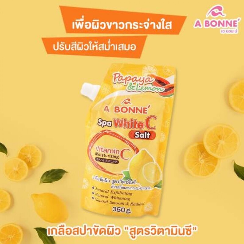 Muối Tắm Tẩy Tế Bào Chết Thái Lan A bonne chanh 350g đến từ thương hiệu mỹ phẩm chăm sóc da của Thái Lan A Bonné. Sản phẩm nổi bật với thành phần chứa chiết xuất từ thực vật gồm chiết xuất đu đủ và chiết xuất chanh tay, giúp làm sạch da, tẩy tế bào chết hiệu quả trên da, dưỡng trắng da, cải thiện những vùng da không đều màu, chống lão hoá.